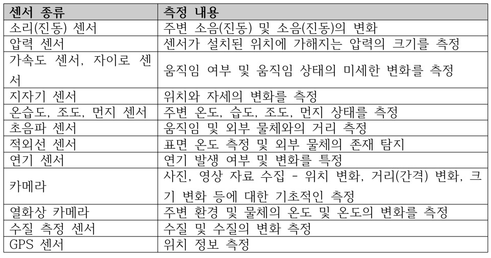 표 1. 활용 가능한 대표적인 센서의 종류와 측정 내용의 예시