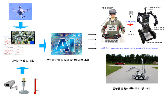 그림 17. 미래의 문화재 돌봄 기반 서비스 개념도 (데이터 수집 및 통합 –> 문화재 관리 및 수리 방안의 자동 추출 –> 로봇을 활용한 원격 관리 및 수리 작업)