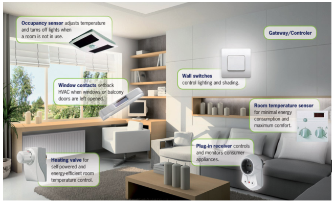 그림 2. 실내에 배치된 센서 + 네트워크의 결합을 바탕으로 한 공간 상황 모니터링 개념 (그림 출처: https://www.achrnews.com/articles/131813-enocean-alliance-control-network )