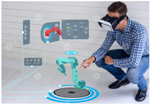그림 20. 원격 로봇 컨트롤을 통한 작업 개념 (그림 출처: https://www.dreamstime.com/iot-smart-technology-futuristic-industry-concept-engineer-use-augmented-mixed-virtual-reality-to-education-training-r-image130185366)